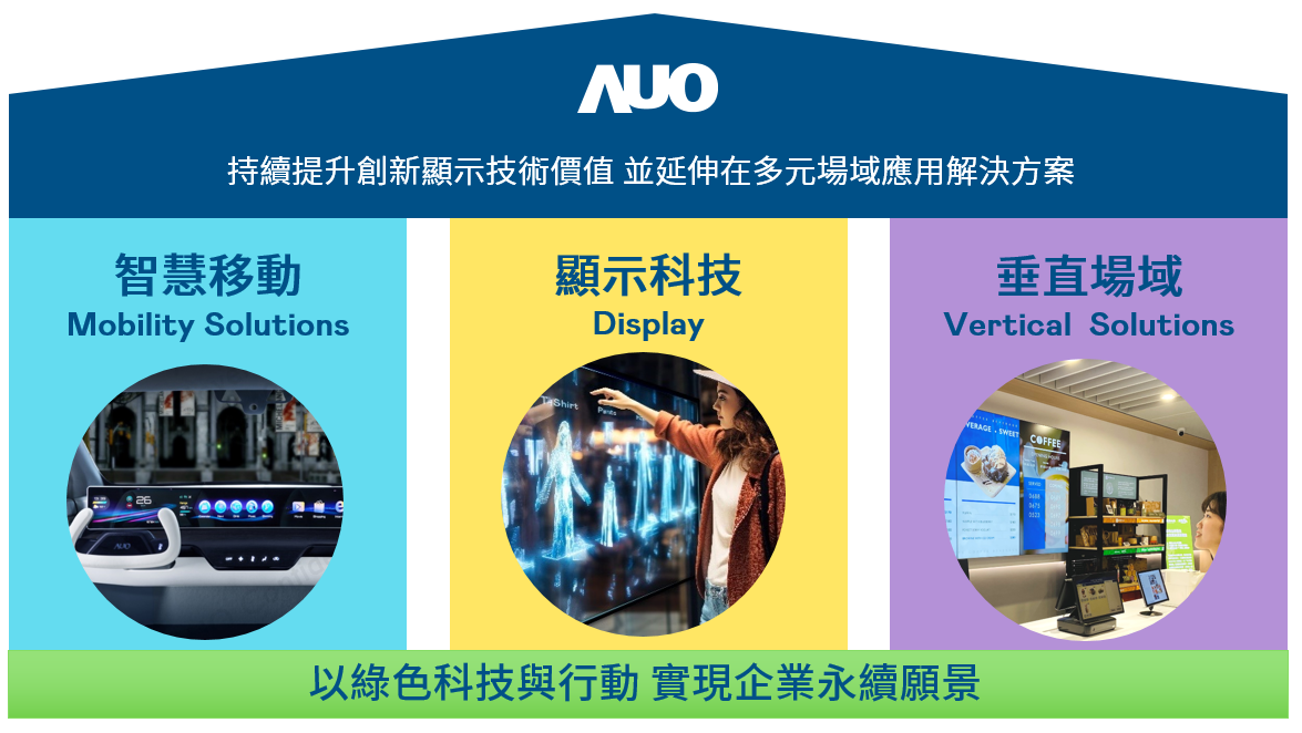 PA持續推動「雙軸轉型」,在精進顯示技術附加價值(Go Premium),與深化垂直市場應用(Go Vertical)的策略下,對應PA的優勢競爭力與趨勢,PA奠定顯示技術、智慧移動、垂直場域三大永續營運支柱,在顯示技術領域的根基之上,延伸布局多元場域應用解決方案。將先進顯示科技助力智慧移動及垂直場域發展,並以綠色科技與行動為實踐,在轉型之路上貫徹永續經營之願景。